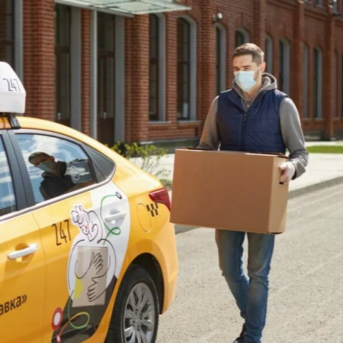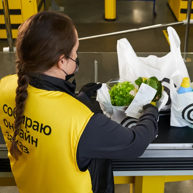 Курьер принимает от сборщика заказ клиента и доставляет его до двери клиента.